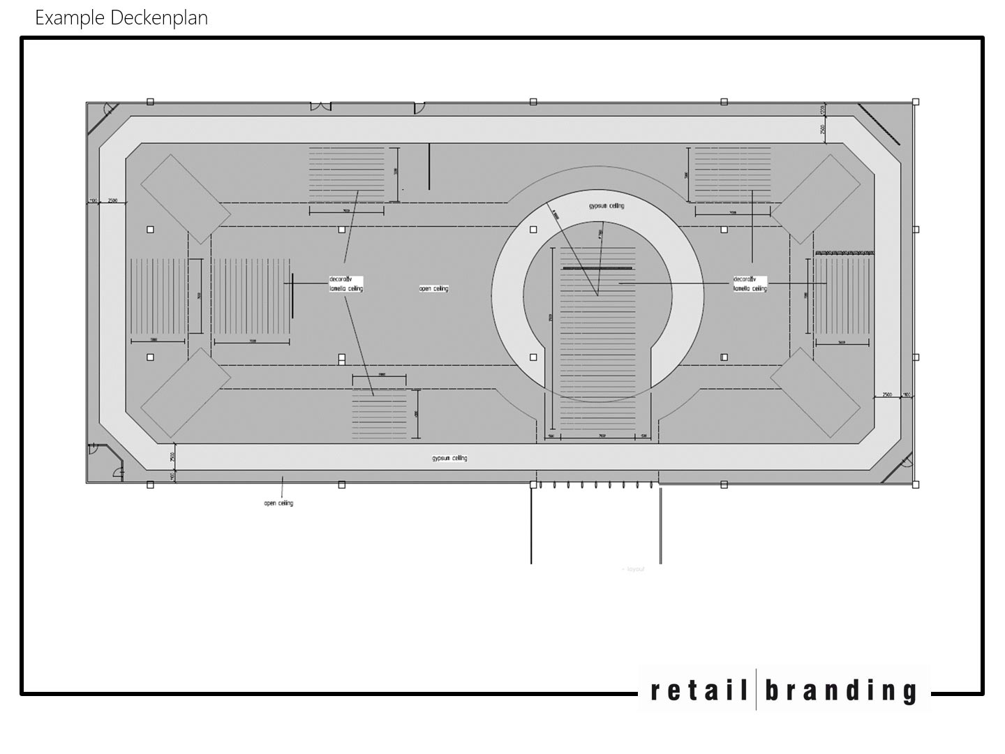 Der Boden- und Deckenplan beinhaltet den konkreten Vorschlag für Boden- und Deckengestaltung inkl. Materialauswahl sowie Lieferantenvorschläge, wo notwendig auch die maßstabsgetreue Darstellung der Deckenplanung.