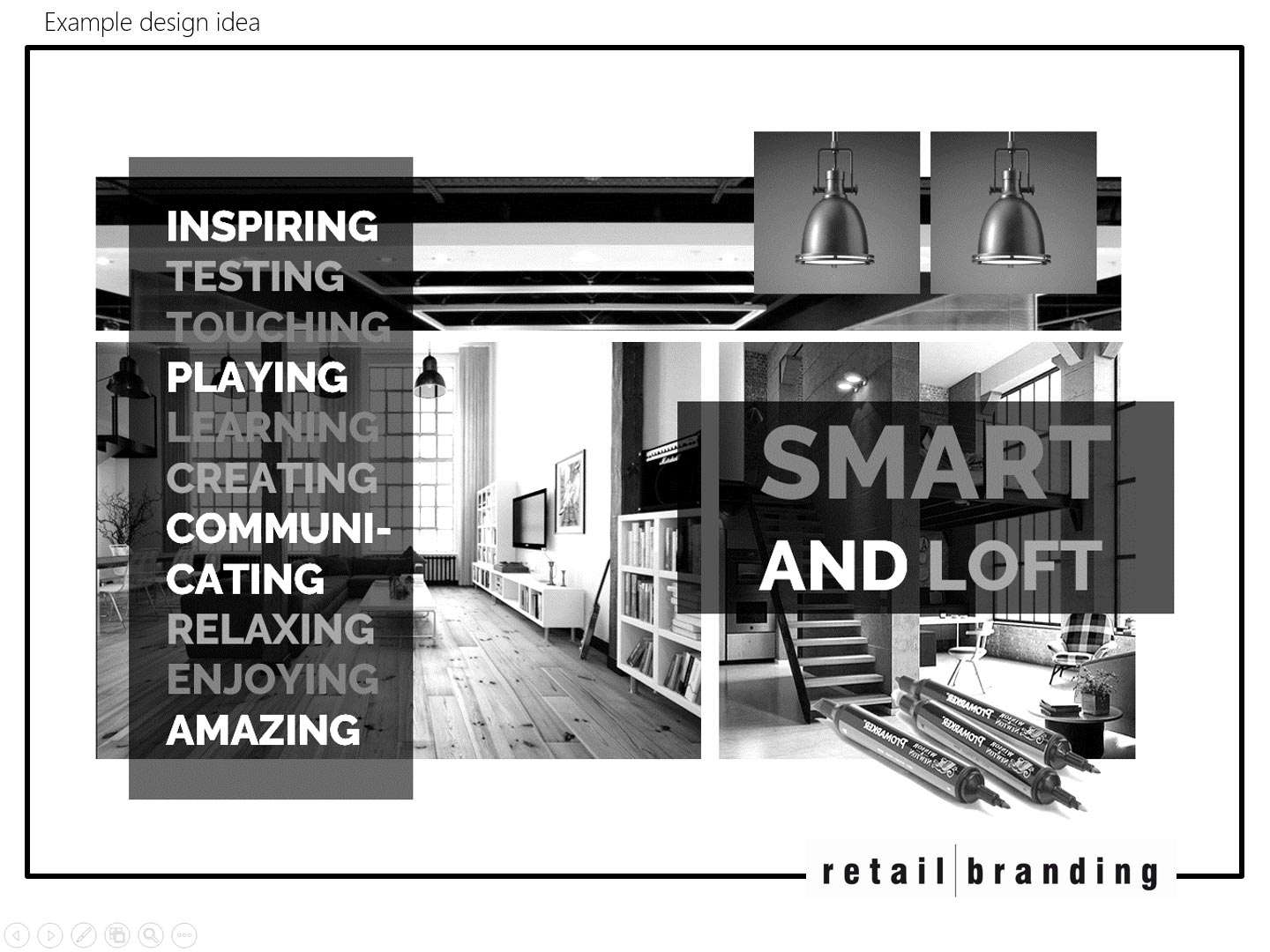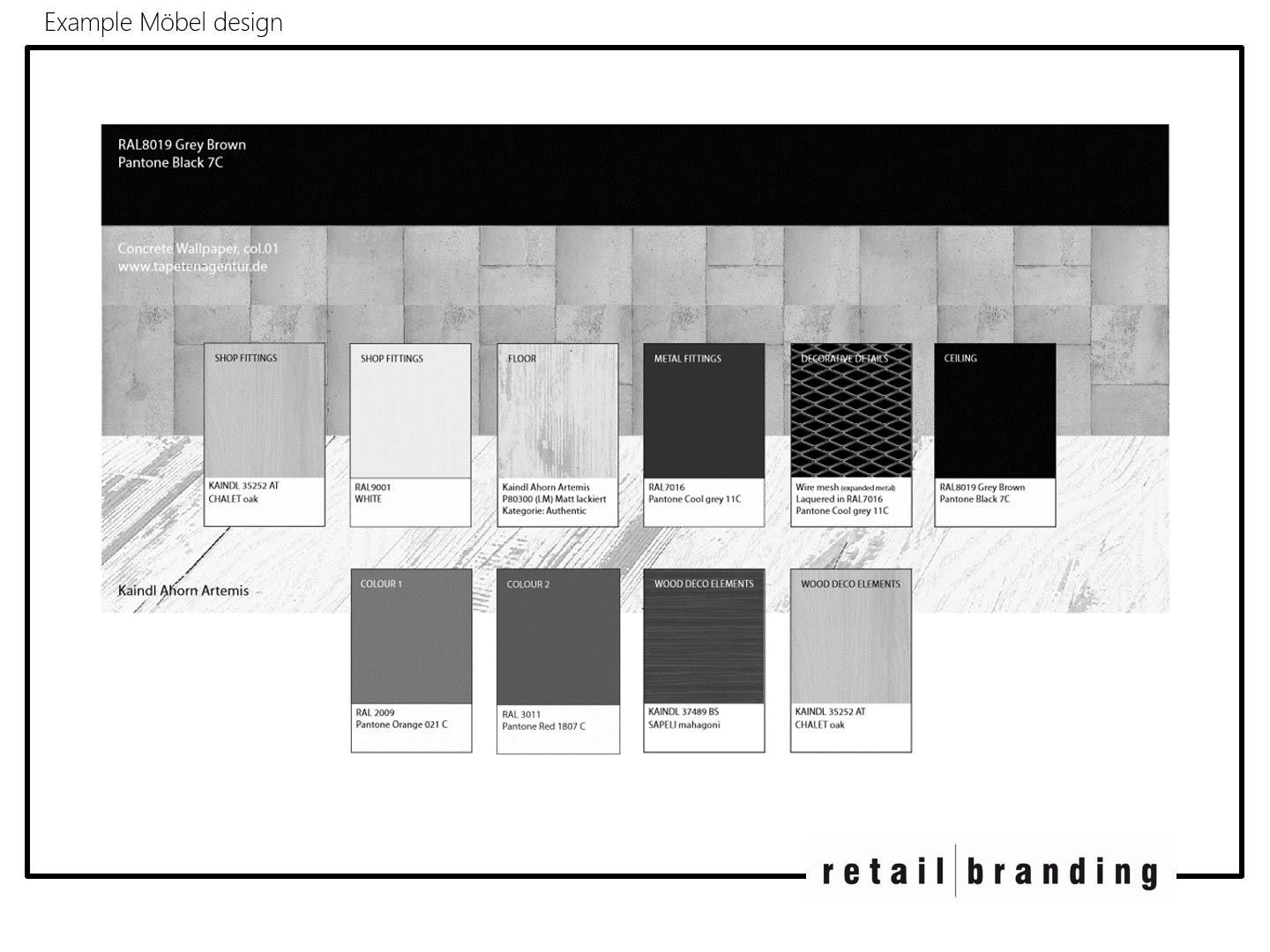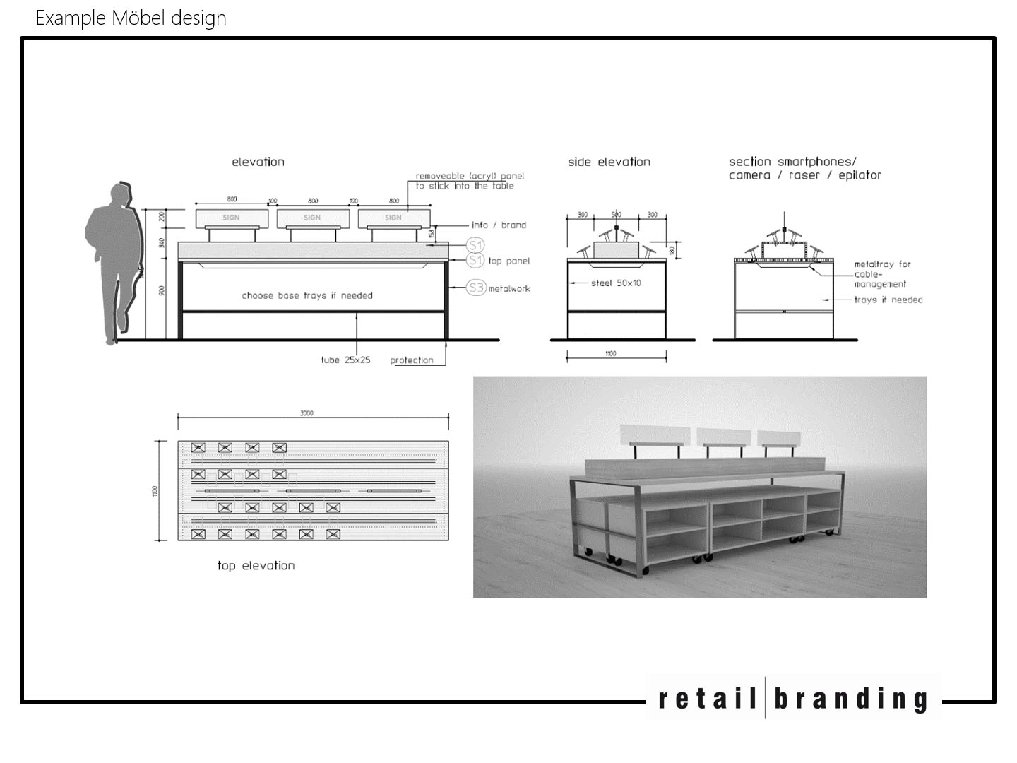 Mit Hilfe von Skizzen, Plänen und Renderings werden die wesentlichen Ideen des neuen Marktauftritts dargestellt. Bestandteil der Darstellung sind Grundrissvorschlag, Teilbereiche der Wandabwicklung, Mittelraumelemente, Branding-Entwurf, Farb- und Materialideen etc. Die Darstellung der künstlerischen Idee soll einen ersten Eindruck vom neuen Konzept anschaulich widergeben.