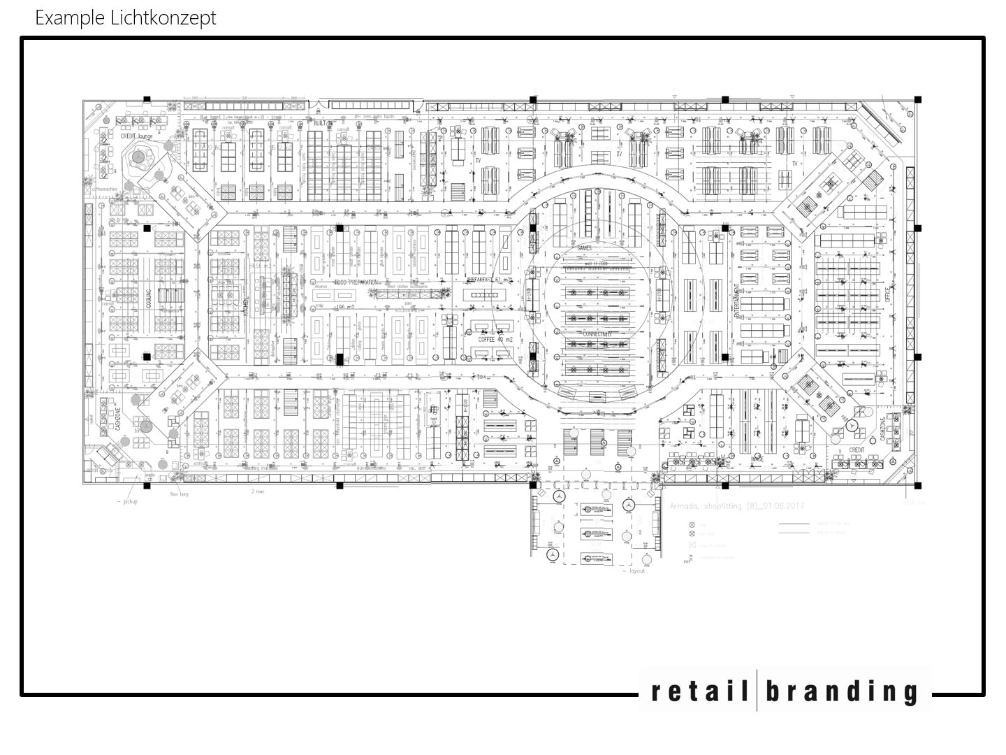 Das Lichtkonzept beinhaltet den maßstabsgetreuen Lichtplan, die technische Beschreibung der Leuchtkörper, einen Grundrissplan mit Lux-Angaben und ein 3D-Rendering für die Ausleuchtungsstärke im Verkaufsraum.