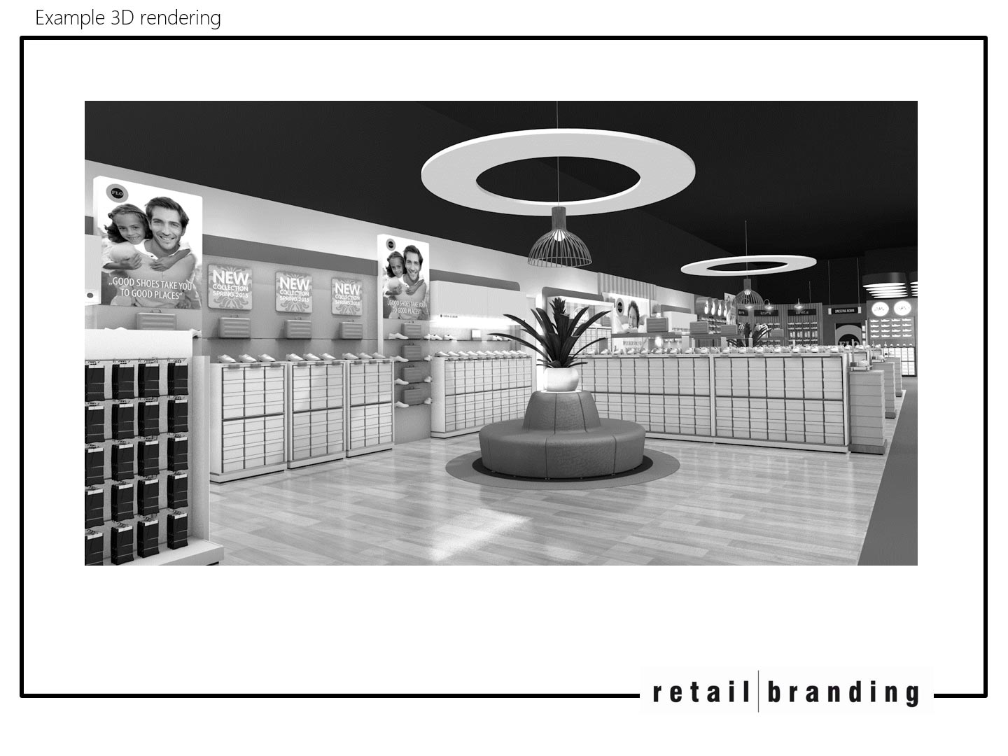 Das 3D-Rendering beinhaltet eine computeranimierte dreidimensionale Darstellung des fertigen Store Design-Konzeptes.