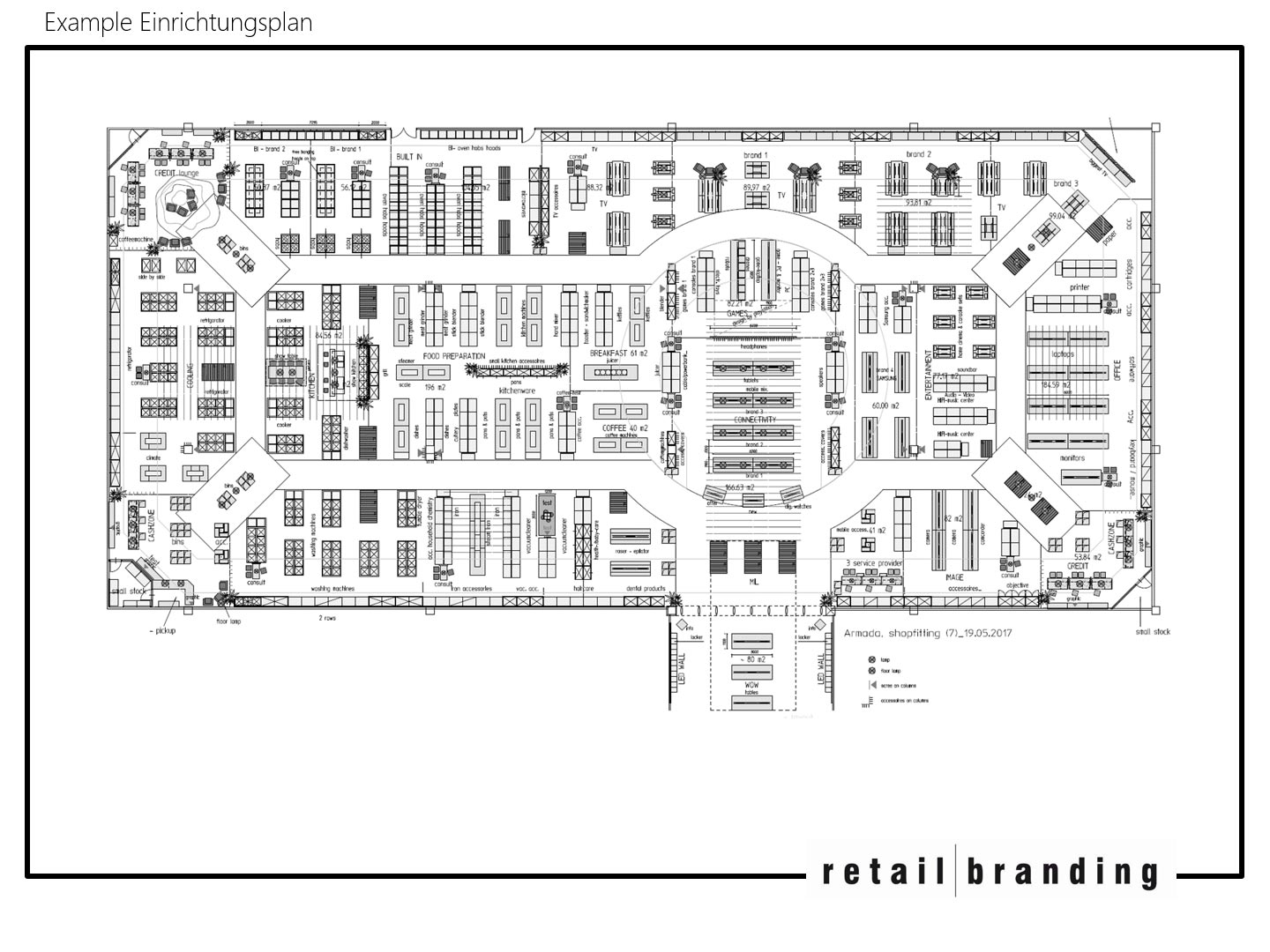 Der Einrichtungsplan stellt die inhaltliche Verfeinerung des Laden-Layouts dar, d. h. alle Mittelraummöbel, alle Ladenbauelemente der Wandabwicklung sowie alle infrastrukturellen Einrichtungselemente (z. B. Kassa, Verpackungstische ...) werden im exakten Maßstab eingezeichnet.