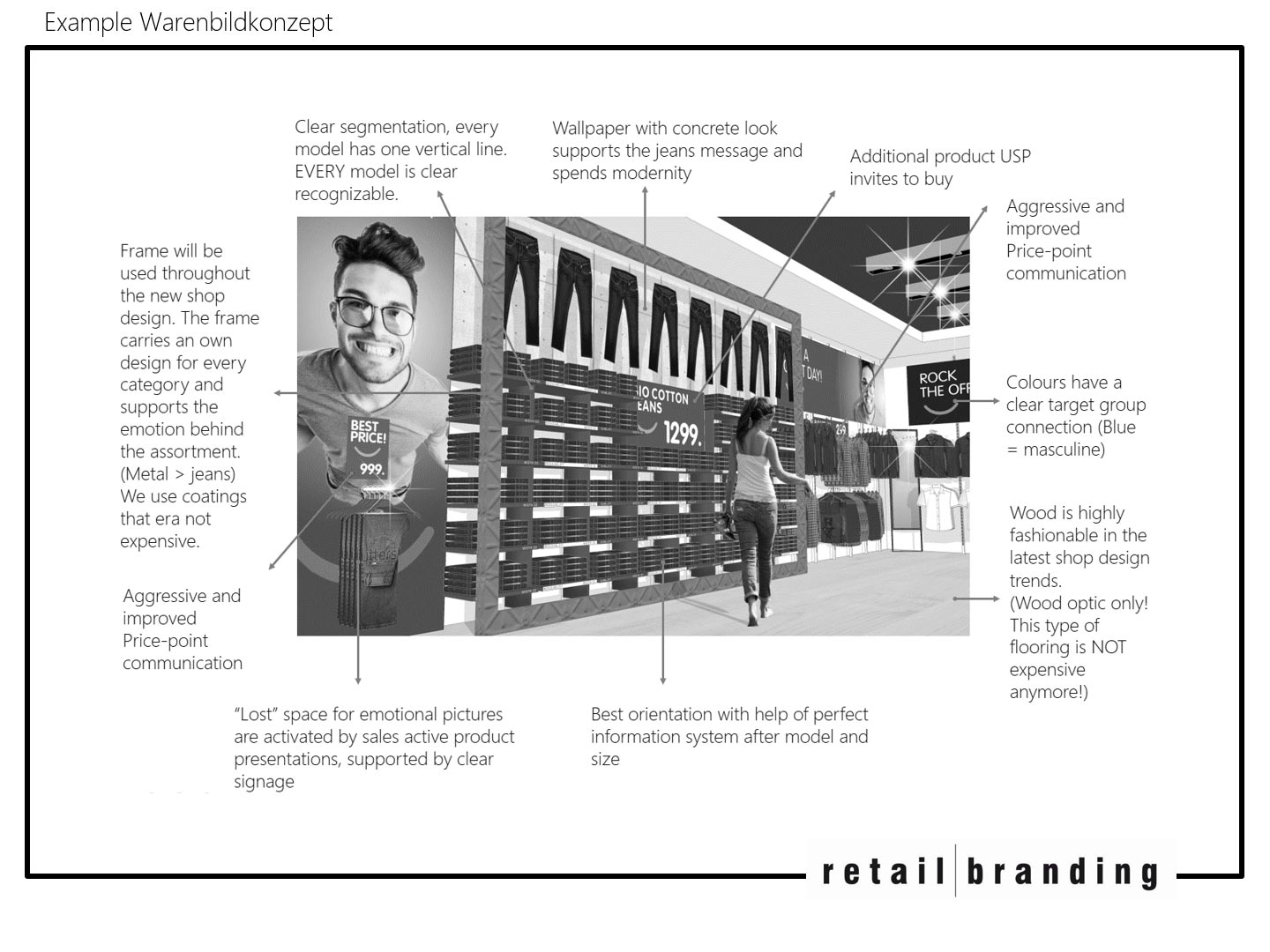 retail branding ist Generalist für die Entwicklung des Marktauftrittes von Einzelhändlern und Marken am POS. Aus einer Hand werden die einzelnen Leistungen miteinander verknüpft. Beispielhafte Darstellung der möglichen Leistungsmodule im Store Design: